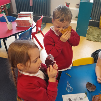 We have been learning about the difference between deciduous and evergreen trees. We looked at different leaves and described them.